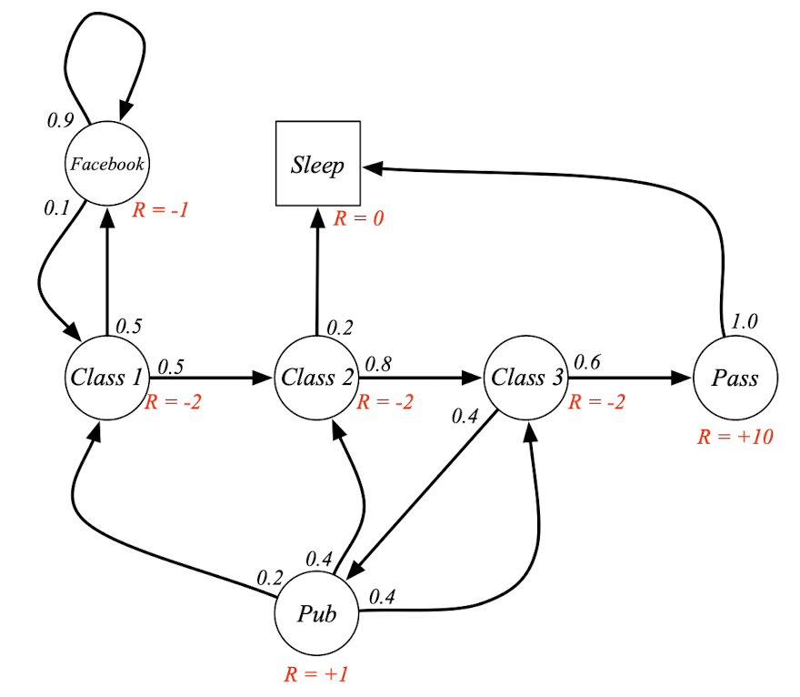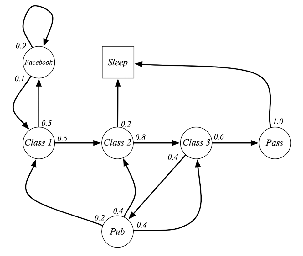 Markov process는 노드로 대응되는 state와 간선으로 대응되는 상태 전이 확률 값으로 이루어진 그래프 형태로 주로 나타낸다.