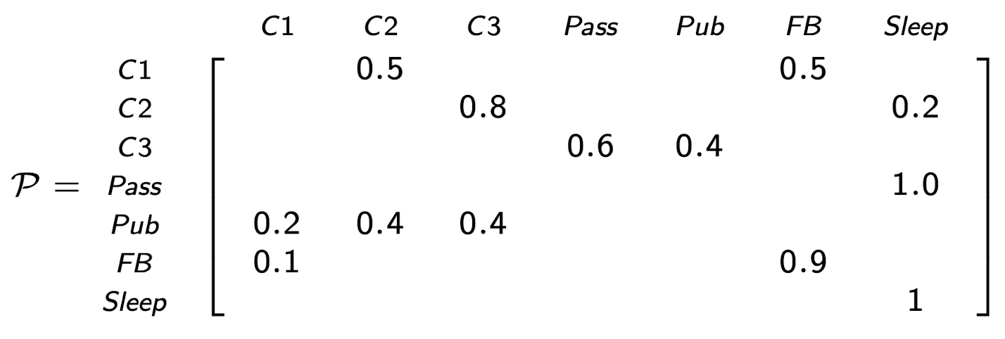 이 경우 state transition matrix $\mathcal{P}$는 다음과 같다.