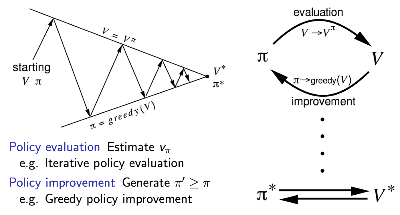 On-policy learning의 대표적인 예시는 Monte-Carlo control and Temporal Difference control인데, 하나씩 다뤄보자. 먼저 ㅇdynamic programming에서 배웠던 policy iteration을 상기해보자. 우리가 배웠던 policy iteration은 iterative policy evaluation과 greedy policy improvement를 합친 알고리즘이었는데, 사실 policy evaluation과 improvement에 다른 알고리즘을 사용해도 가능하다. 일단 $\pi$를 evaluation 알고리즘을 통해 평가하고 improvement 알고리즘으로 성능을 발전시키면 그만이기 때문이다.